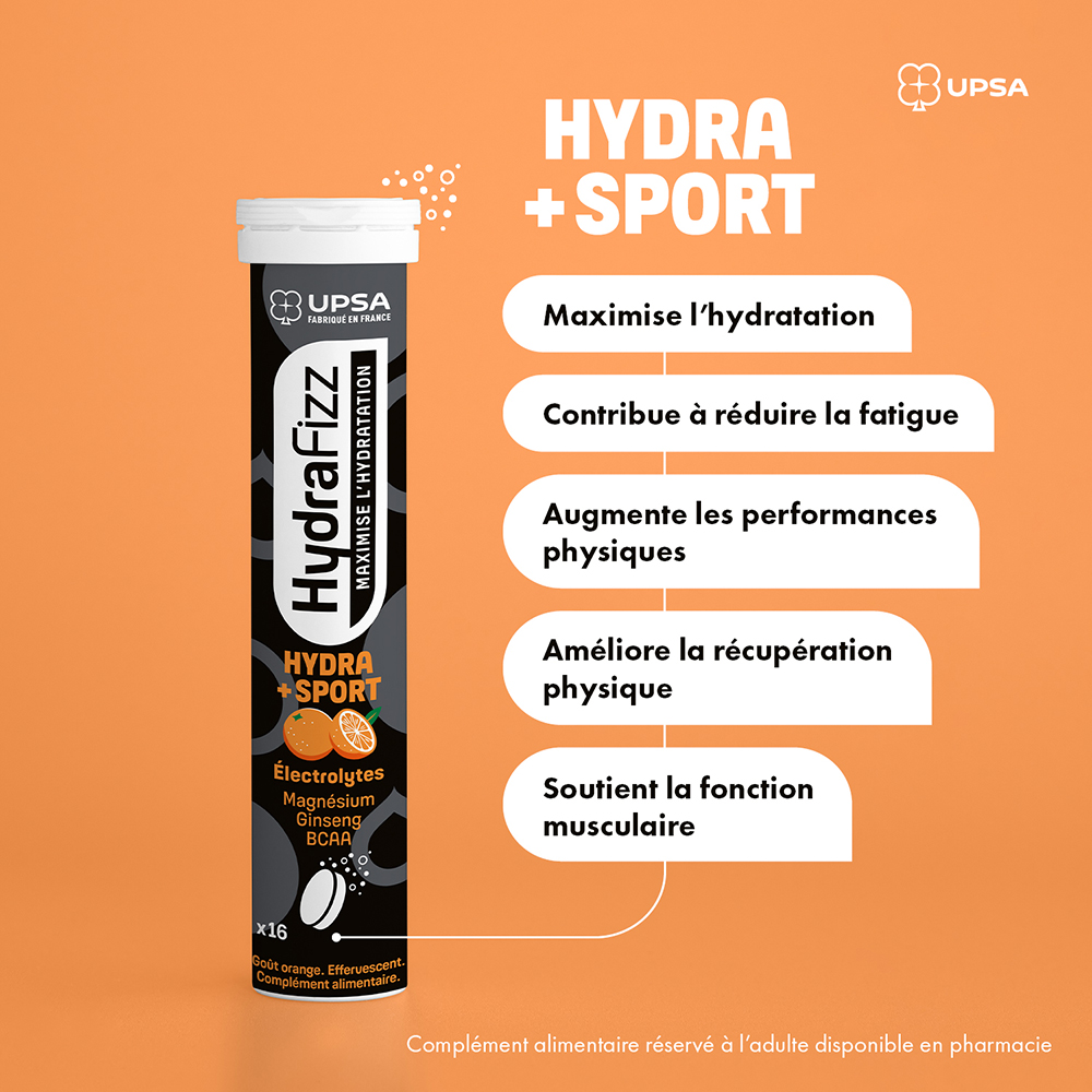 Pour vous aider dans vos efforts sportifs, le laboratoire UPSA a créé Hydrafizz Hydra Sport : le comprimé effervescent qui maximise l’hydratation de votre corps tout en boostant vos performances sportives et votre récupération. Grâce à la combinaison du glucose et du sodium, l’eau traverse plus efficacement la barrière intestinale, garantissant une meilleure assimilation par l’organisme. Découvrez comment Hydra Sport maximise l’hydratation tout en améliorant les performances physiques et en accélérant la récupération grâce à l’association des électrolytes, du glucose, de la vitamine C, du ginseng et des BCAA.