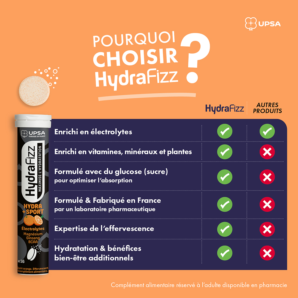 Développés avec l’expertise des laboratoires UPSA, les comprimés Hydrafizz bénéficient d’une technologie effervescente avancée pour une dissolution sans dépôt et une assimilation optimale. Toutes les étapes de leur chaîne de production sont maîtrisées par UPSA, de l’élaboration de leurs recettes à leur fabrication en France. Conçus selon les recommandations de l’EFSA, nos comprimés hydratants sont développés pour répondre aux besoins quotidiens en hydratation des consommateurs.
